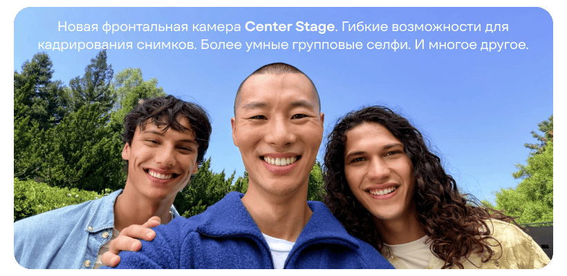 Новая фронтальная камера Center Stage с разрешением 18 Мп полностью меняет представление о кадрировании. Впервые технология Center Stage стала доступна для фотографий. Инновационный квадратный сенсор предлагает опции зума и поворота, обеспечивая более гибкие возможности кадрирования селфи и видео. Он интеллектуально настраивается, чтобы автоматически включить всех участников в групповой снимок. Камерная система также представляет функцию Dual Capture video, позволяющую записывать себя и окружающий мир с помощью одновременной съемки на переднюю и заднюю камеры. Даже когда вы находитесь в движении, вы можете снимать потрясающе плавное видео 4K 60 fps в Dolby Vision благодаря ультра стабилизированной видеотехнологии. Для вашей виртуальной жизни Center Stage для видеозвонков использует искусственный интеллект для автоматической настройки кадра, гарантируя, что вы всегда будете в центре внимания во время каждого звонка и встречи в FaceTime.
