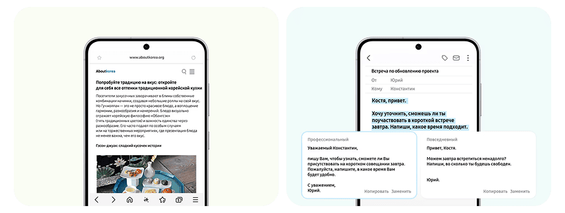 Нужно быстро что-то записать? С функцией «Помощник в написании» это проще простого! Она не только улучшит вашу грамматику и переформулирует предложения, но и найдет правильный тон – будь то текстовые сообщения, электронные письма или заметки. Просто запишите свои мысли, а искусственный интеллект добавит вашим словам ясности и стиля.