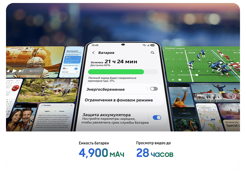 Превосходная производительность мобильного Galaxy S25 FE поддерживается батареей емкостью 4900 mAh, которая гарантирует отличную автономность в течение всего дня. Благодаря быстрой зарядке по кабелю вы можете зарядить устройство на 65% всего за 30 минут, так что оно будет готово к использованию в невероятно короткие сроки.