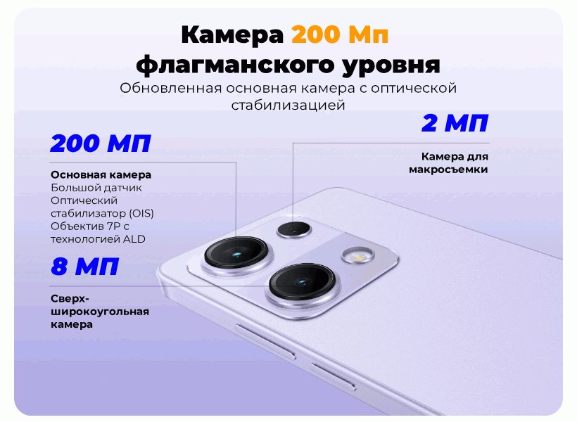 Redmi Note 14S оснащен 200 Мп основной камерой с OIS (оптической стабилизацией изображения) и EIS (электронной стабилизацией изображения) для сверхстабильных снимков. Независимо от того, снимаете ли вы быстро движущиеся сцены или снимаете при слабом освещении, двойная технология защиты от дрожания обеспечивает четкие фотографии без размытия. Благодаря автофокусу Super QPD камера мгновенно наводит фокус на объект, поэтому вы никогда не упустите момент. Будь то спонтанный снимок или запланированный портрет, Redmi Note 14S всегда обеспечивает четкие снимки высокого разрешения.