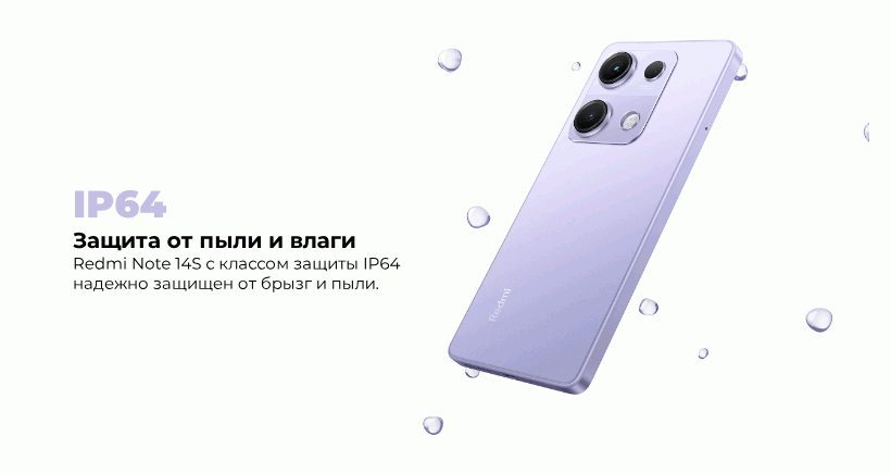Класс защиты IP64 означает, что Redmi Note 14S может выдерживать попадание пыли и брызг воды, что делает его надежным спутником в различных условиях. Технология Wet Touch даже при влажных пальцах дисплей остается отзывчивым, что снижает количество случайных прикосновений и обеспечивает плавную работу в любых условиях.