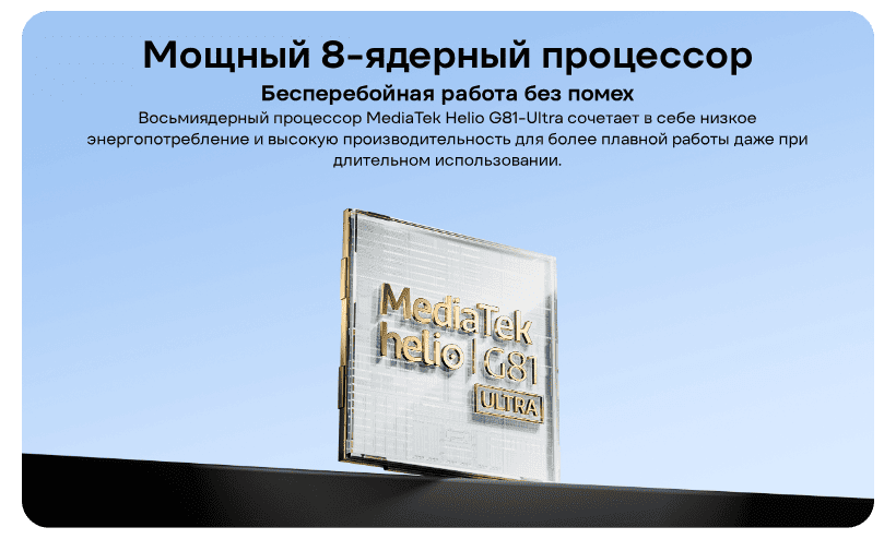 Под капотом Redmi 15C находится процессор MediaTek Helio G81 Ultra, построенный на 12-нм архитектуре. В сочетании с 4 ГБ оперативной памяти LPDDR4X телефон эффективно справляется с многозадачностью и играми. Варианты хранения данных включают 128 или 256 ГБ с возможностью расширения с помощью слота для карт microSD.